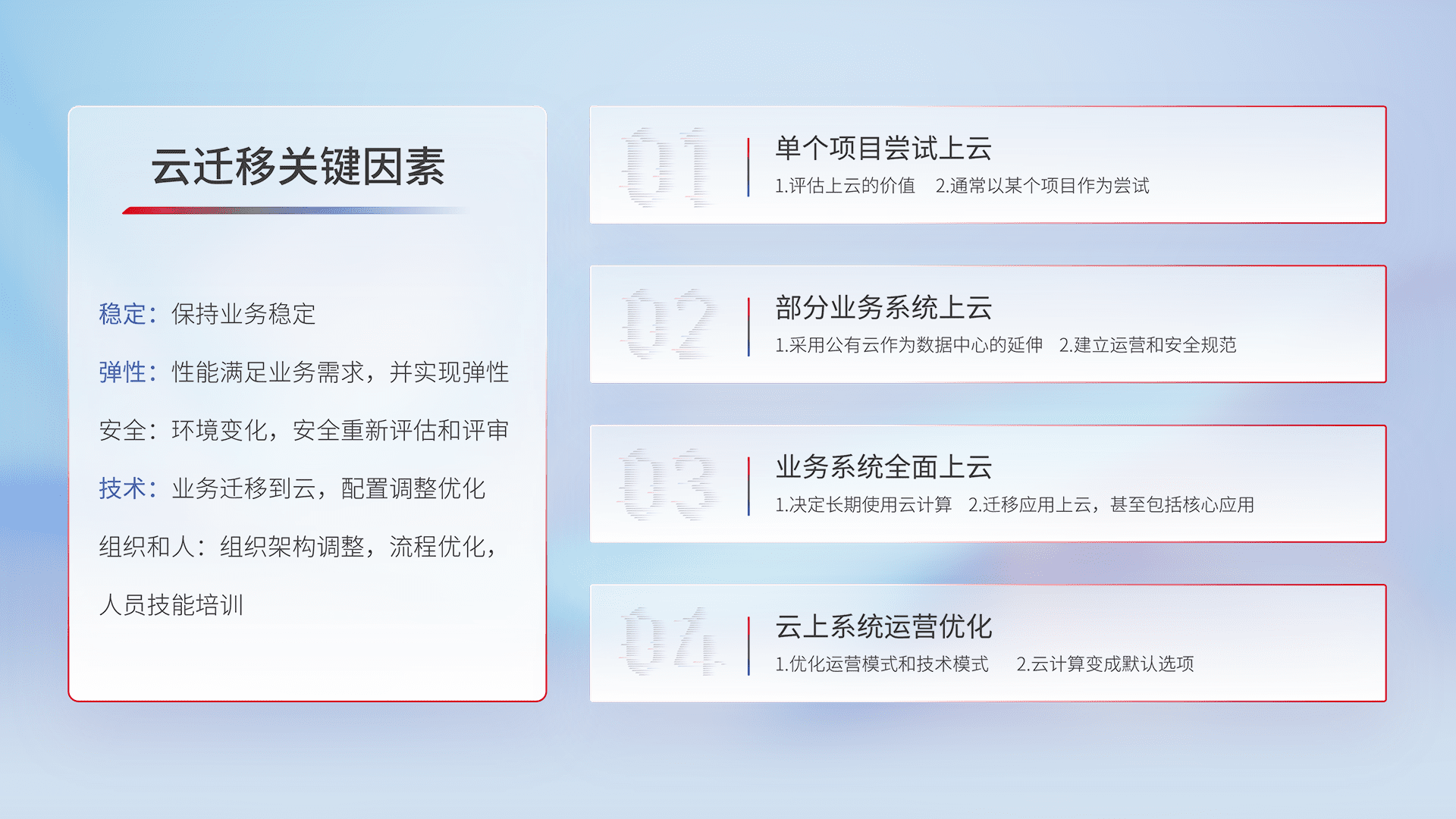 结合实际业务,,从规划设计、、、、云平台选型、、、、云原生改造、、、数据迁移、、、、集成交付,,,迁移全过程为客户识别最佳上云路径,,,,做好风险识别管理,,设计网络架构、、、、身份权限、、、、安全审计合规、、、操作审计、、日志审计、、监控告警策略、、多站点容灾设计等,,对云上基础设施进行整体规划,,提升IT治理水平,,以满足弹性、、高可用、、高性能的需求。。。。